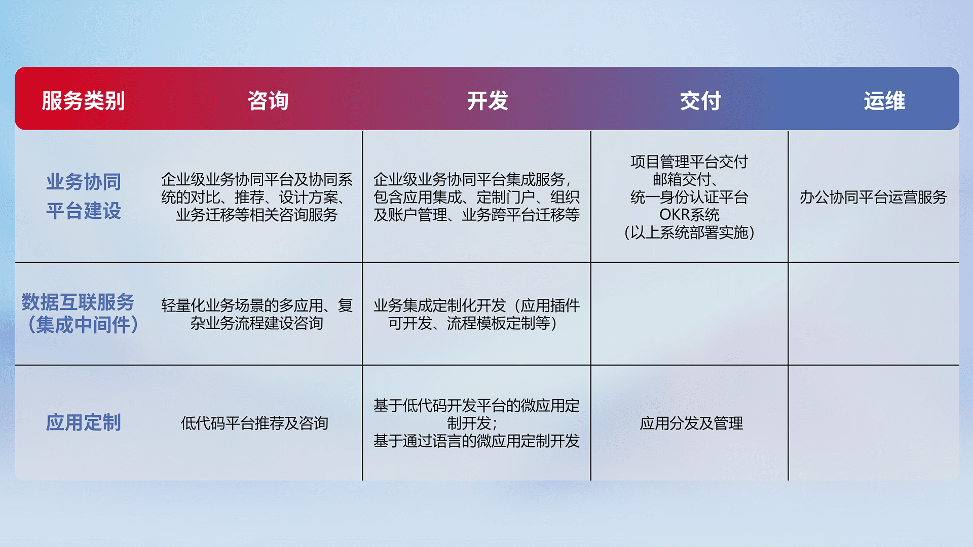 针对钉钉、、、企微、、、、IDaas等平台级产品提供产品的规划、、方案、、、交付、、、定制化开发等服务,,,,实现如统一协同办公、、、智能客户服务、、、、混合会议管理、、、智能数据查询、、、等业务场景,,,,实现数字化转型。。。